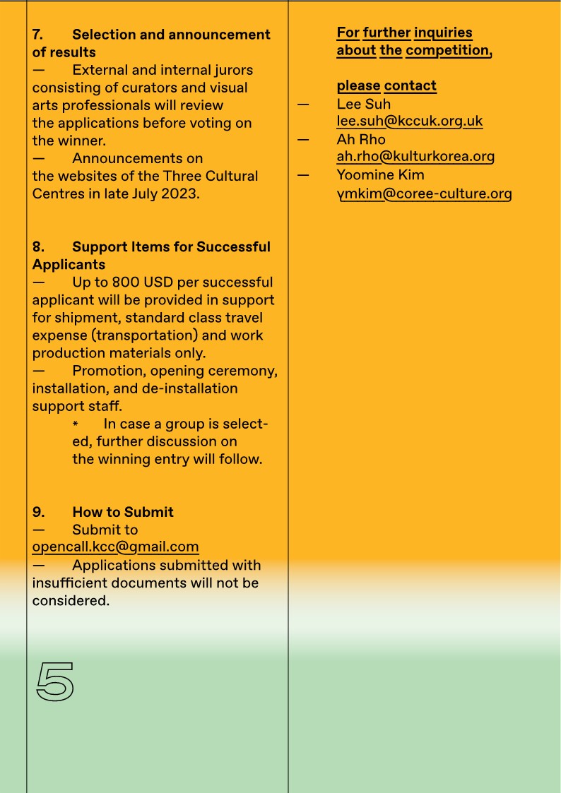 * For further inquiries about the competition, please contact Lee Suh (lee.suh@kccuk.org.uk), Ah Rho (ah.rho@kulturkorea.org), or Yoomin Kim (ymkim@coree-culture.org)