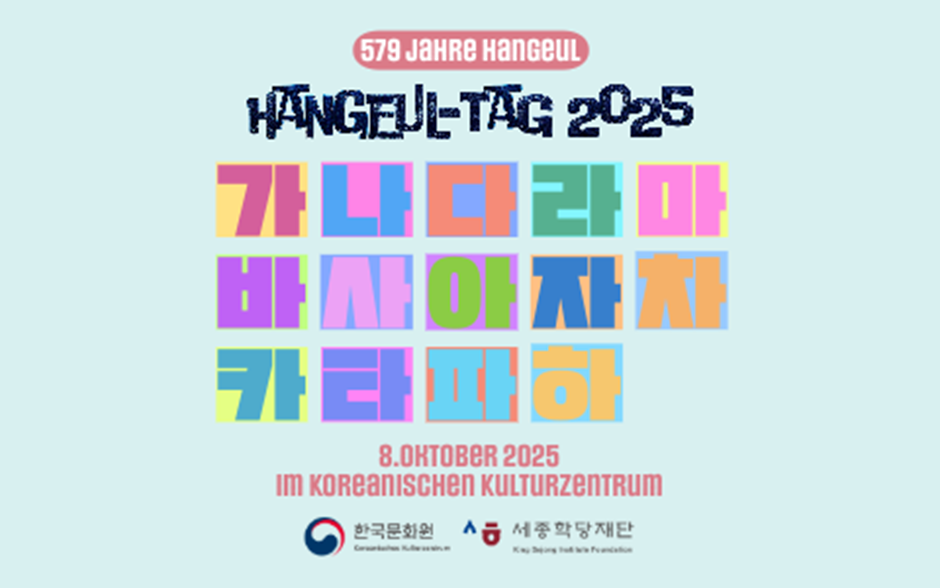 Am 9. Oktober feiert man alljährlich in Südkorea die Verkündung des koreanischen Alphabets Hangeul, den sogenannten „한글날“ (Hangeulnal, Hangeul-Tag)! Zur Feier des 579. Hangeul-Tags lädt das Koreanische Kulturzentrum am 8. Oktober 2025 um 17:30 Uhr herzlich zu sich ein.